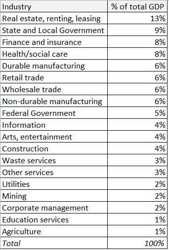 So Information Technology isn’t growing in the GDP statistics because everything it touches becomes cheap or free. It’s the economics of zero marginal costs as applied to digital goods, which I’veposted about before.Great for consumers and society overall, a disaster for producers. See how Information Technology (at 4% of GDP) fits into the bigger picture below (from Wikipeda).