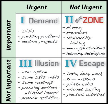- Urgent and Not Important. I’m also a fan of the chart below out of Covey’s Seven Habits book. GTD can be thought of as a way to get yourself into strategic zone II, where you focus on important but not urgent work. At least once a month I need to remind myself that constant firefighting is a sign of bad planning, not being a hero.