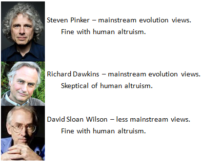 To help illustrate modern views on this topic, I’ll use the people below as stand in representatives: 1. Steven Pinker – mainstream on evolution, and fine with human altruism (under the right conditions). 2. Richard Dawkins – also mainstream on evolution, but more skeptical of human altruism. 3. David Sloan Wilson – non-mainstream on evolution, but similar to Pinker in being fine with human altruism (though his conditions differ from Pinker).