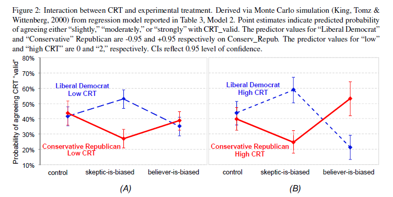 BRT generates a straightforward hypothesis about perception of climate change risks. If the reason ordinary citizens are less concerned about climate change than they should be is that that they over-rely on heuristic, System 1 forms of reasoning, then one would expect climate concern to be higher among the individuals most able and disposed to use analytical, System 2 forms of reasoning . In addition, because these conscious, effortful forms of analytical reasoning are posited to “counteract the emotionally comforting desire for confirmation of one’s beliefs” (Weber & Stern 2011), one would also predict that polarization ought to dissipate among culturally diverse individuals whose proficiency in System 2 reasoning is comparably high.
