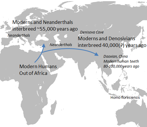 Homo erectus, dating from 1.9 million to 70,000 years ago, was the first widely dispersed hominin in Eurasia. Others left Africa in turn. So when modern humans left Africa, there were plenty of hominins to choose from. Melanesians have 4-6% Denisovan ancestry. Tibetans can thank genetic introgression from Denisovans for their high altitude adaptations. Eurasians have 1-4% Neanderthal ancestry. And while I want to be a bit cautious quoting twitter instead of papers, Adam Van Arsdale recently passed along a John Hawks estimate that living humans sample about 50% of Neanderthal DNA in “short rare bits”. Complicates the notion of whether to characterize this as extinction or assimilation.