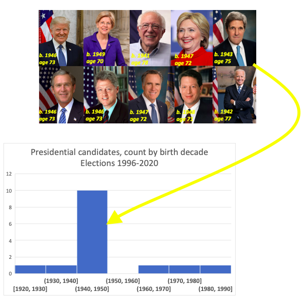 Below is the same data in histogram form. The 10 candidates born 1940-1949 marked in yellow above are pictured. No decade besides the 1940s has more than one candidate. Note the gap in the 1950s. Born just a bit too late.