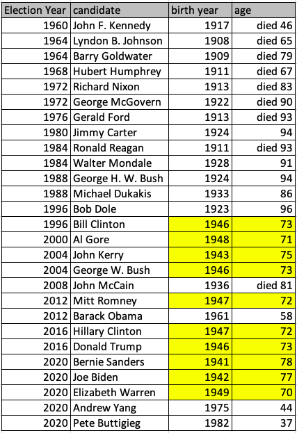 To see how if this definition of cultural boomer holds up, let’s look at the birth years for all candidates for US president from the 1996 through 2020. I marked the cultural boomers, born 1940-1949 in yellow. I see yellow. Lots of yellow. Of course we should be wary of such tiny sample sizes. I suspect a similar chart of congress wouldn’t be as stark. But still, 10 out of 15.
