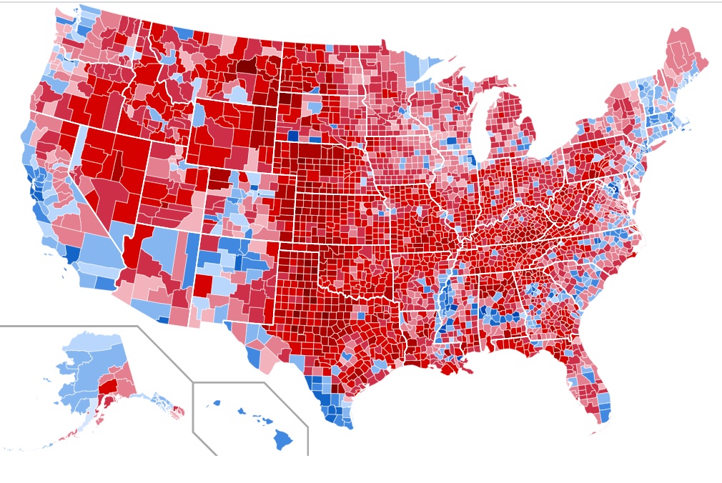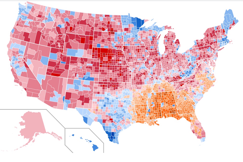 In 2016 below, the split isn’t north/south. It’s about population density. High density democratic, low density republican. Compare California above to below. Or rural Maine.